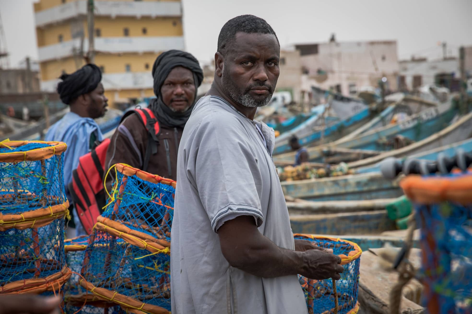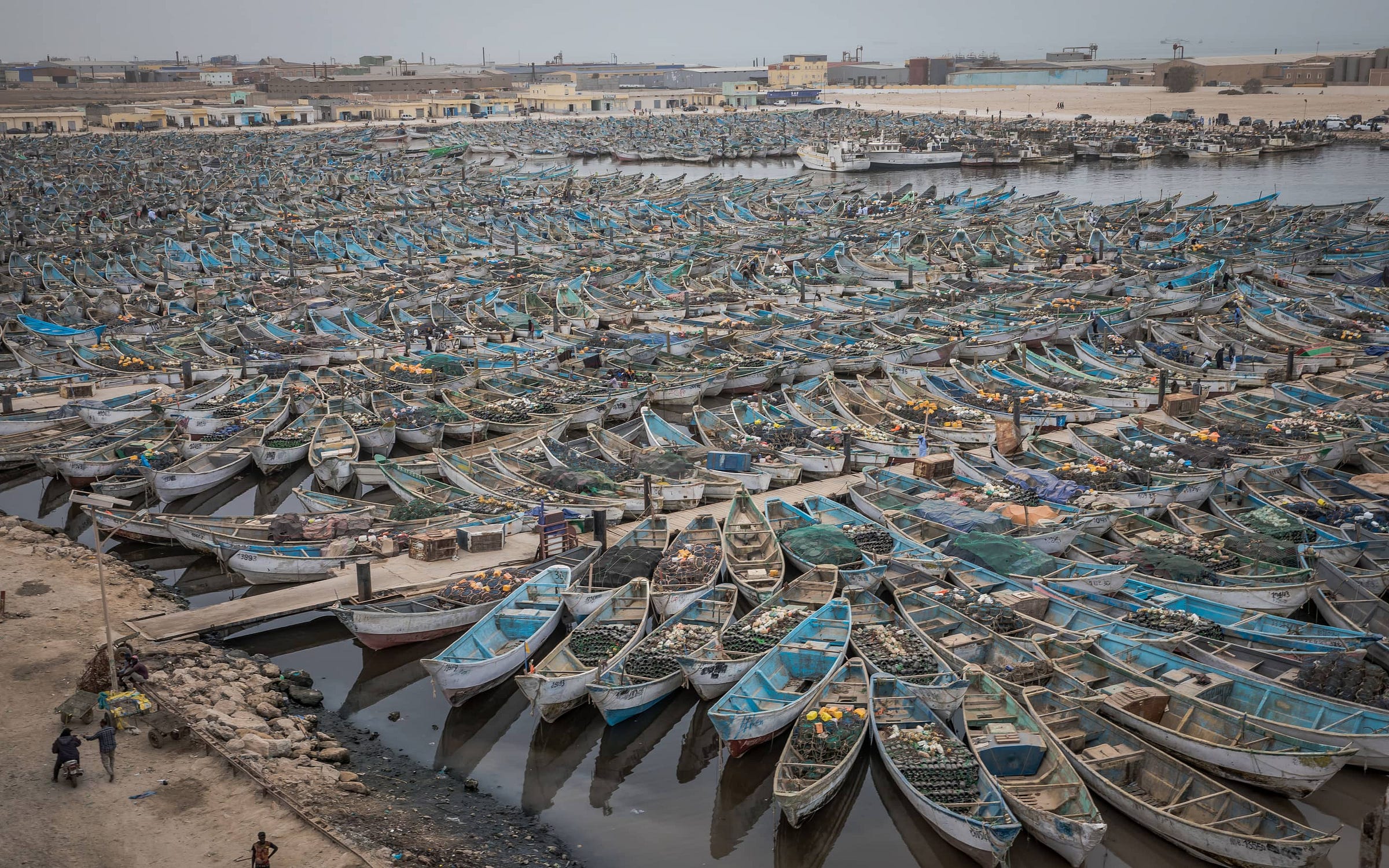 Around him, chaos reigns. Dockworkers load boats with engines, diesel barrels and bags full of baguettes for provisions. Thousands of blue-and-white pirogues – traditional small boats –bob in the water. Fishermen lug sacks filled with freshly killed octopus to traders on the quay. The stench of rotting fish waste hangs heavily in the air.