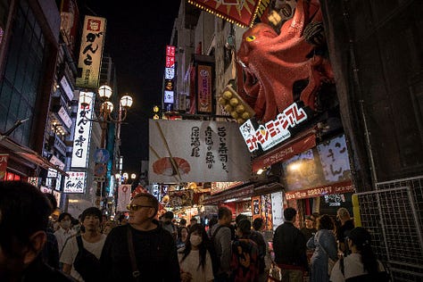 In Osaka, a port city in southern Japan, life truly begins at night. Crowds press beneath neon signs in the old town.