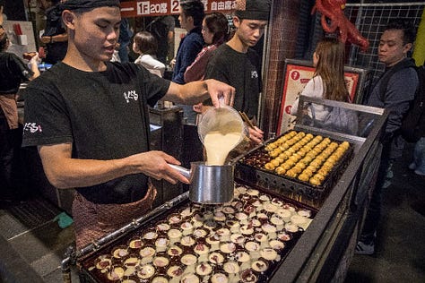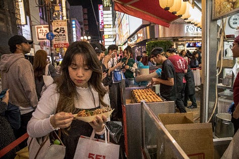 The air smells of takoyaki, a Japanese street-food specialty.