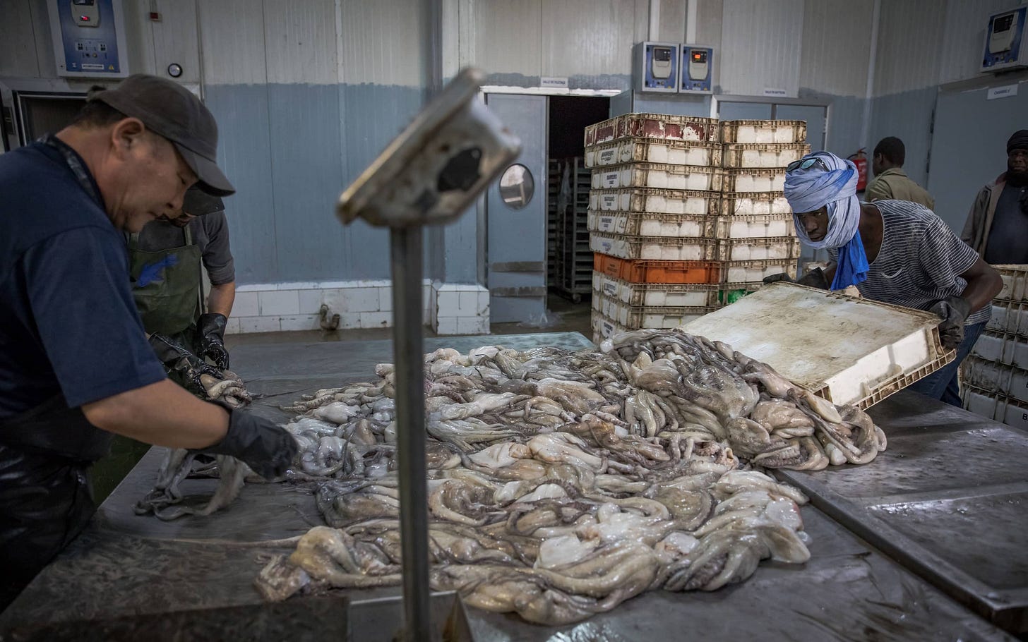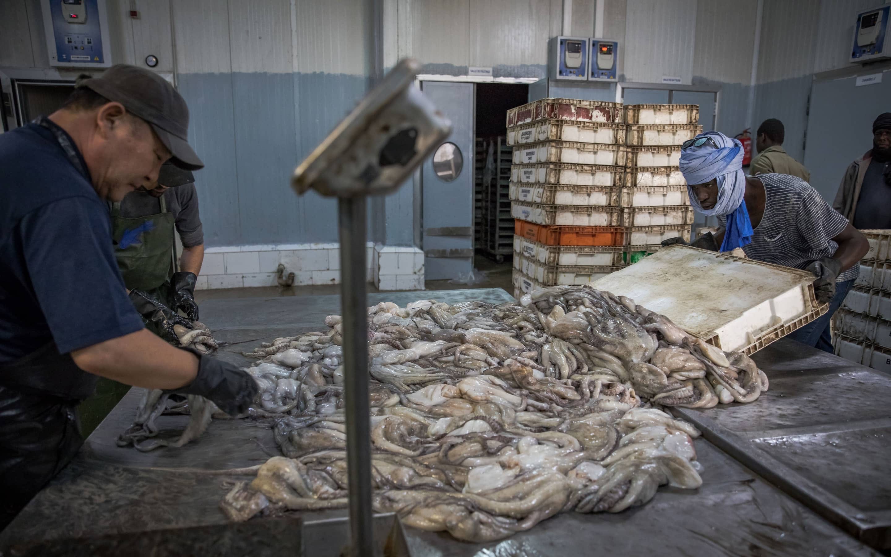 A production shutdown would cost his company millions of euros per day, he says, declining to give further financial details. His daughter Jamila Boughourbal guides visitors through the octopus processing plant in Nouadhibou’s industrial zone.