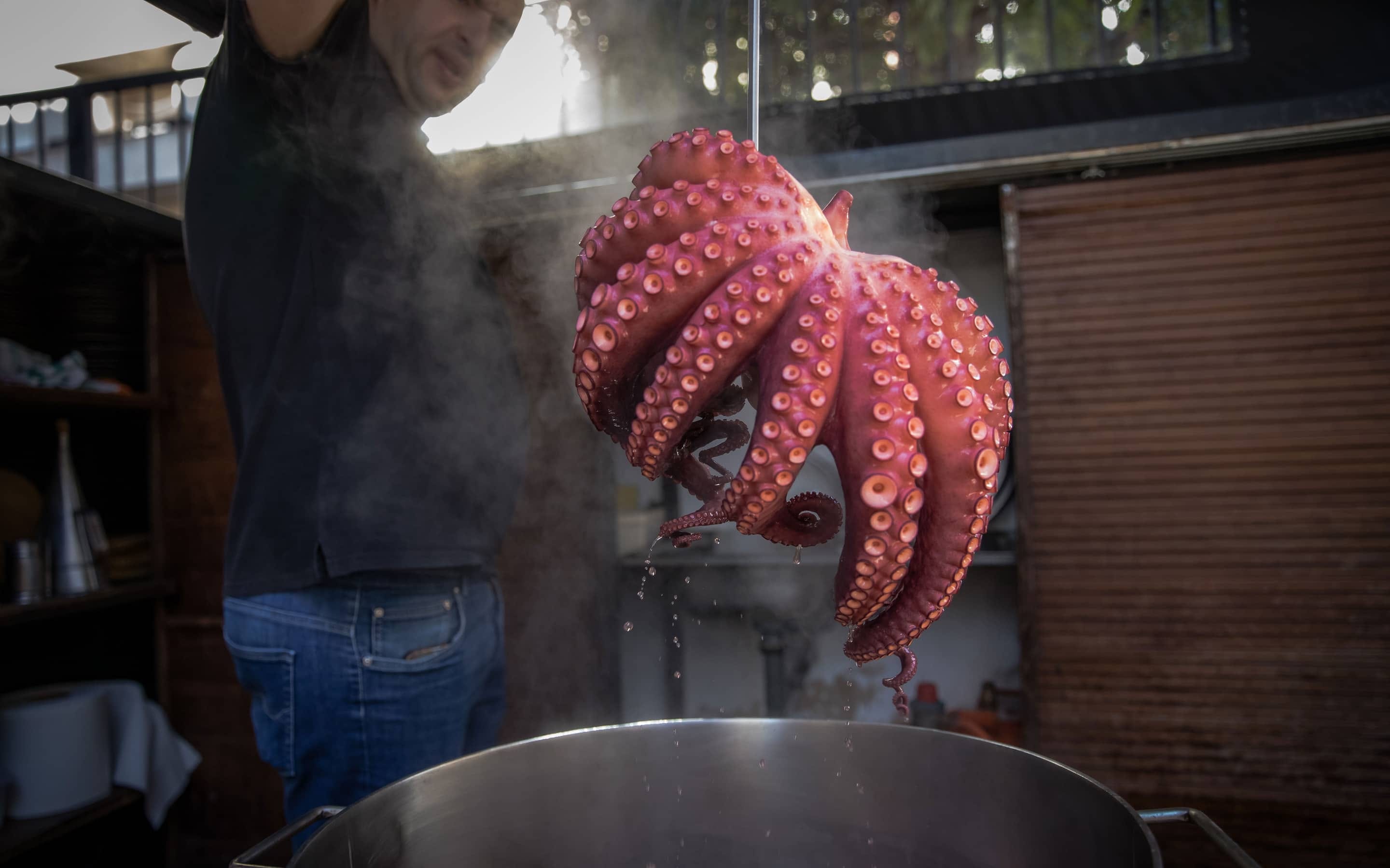The cephalopod is cooked in a cauldron until the flesh and water turn blood-red. It is then served chopped on wooden plates.